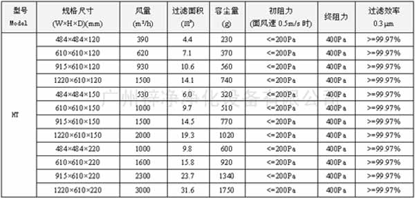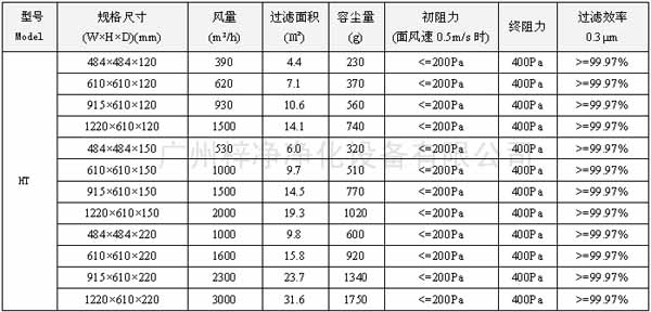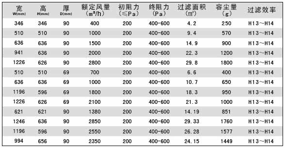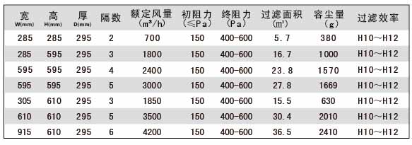 有隔板高效過(guò)濾器規(guī)格尺寸及風(fēng)量容塵量技術(shù)參數(shù):