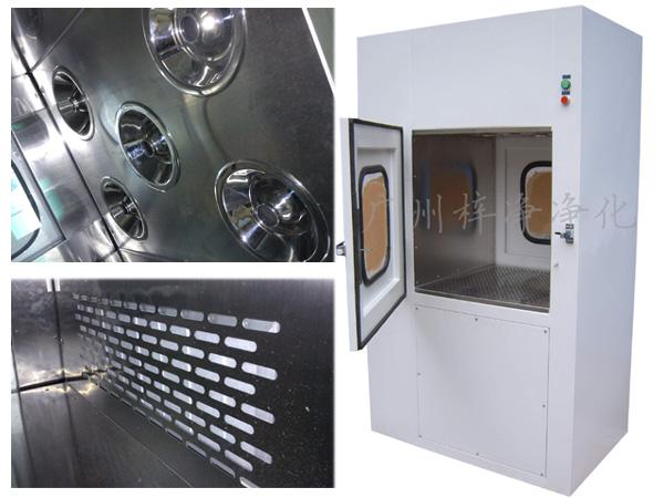 風淋傳遞窗是根據(jù)風淋室模式設計,使風經(jīng)過高效過濾器潔凈后由不銹鋼噴嘴以20m/s以上的風速噴射。風淋傳遞窗特點