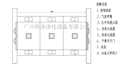 ,污染微粒就經(jīng)高效過濾的高潔凈度潔凈空氣射掉,25m/s以上的高風(fēng)速確保了有效的噴射和漂移微粒經(jīng)過粗高兩級過濾器基本過濾掉。