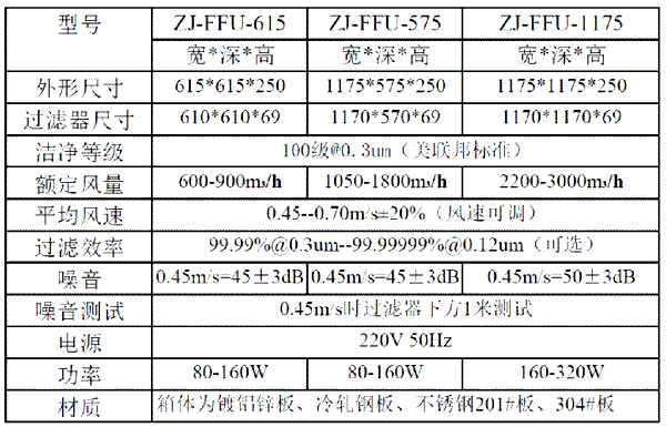 FFU凈化單元規(guī)格尺寸及型號參數: